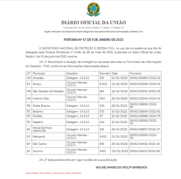 Conforme a portaria, outras cidades do estado vizinho, Pernambuco: Brejinho, Solidão e Itapetim, no Sertão do Pajeú, e em mais nove municípios brasileiros atingidos por desastres naturais estão incluídas na situação de emergência para pedir socorro, assistências às vítimas, restabelecimento de serviços essenciais e reconstrução de infraestrutura destruída ou danificada devido às fortes chuvas nessas cidades.