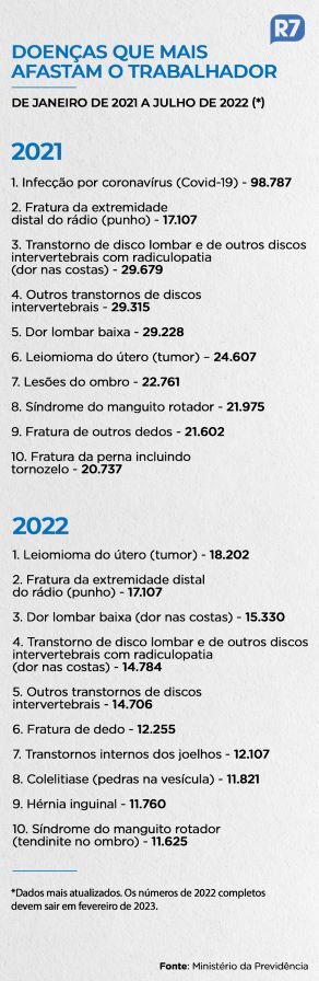 Após liderar o ranking de afastamento do trabalho em 2021, a Covid-19 deixou de figurar na lista de doenças que mais registraram benefícios por incapacidade, o antigo auxílio-doença, do INSS (Instituto Nacional do Seguro Social) em 2022.