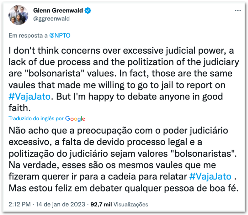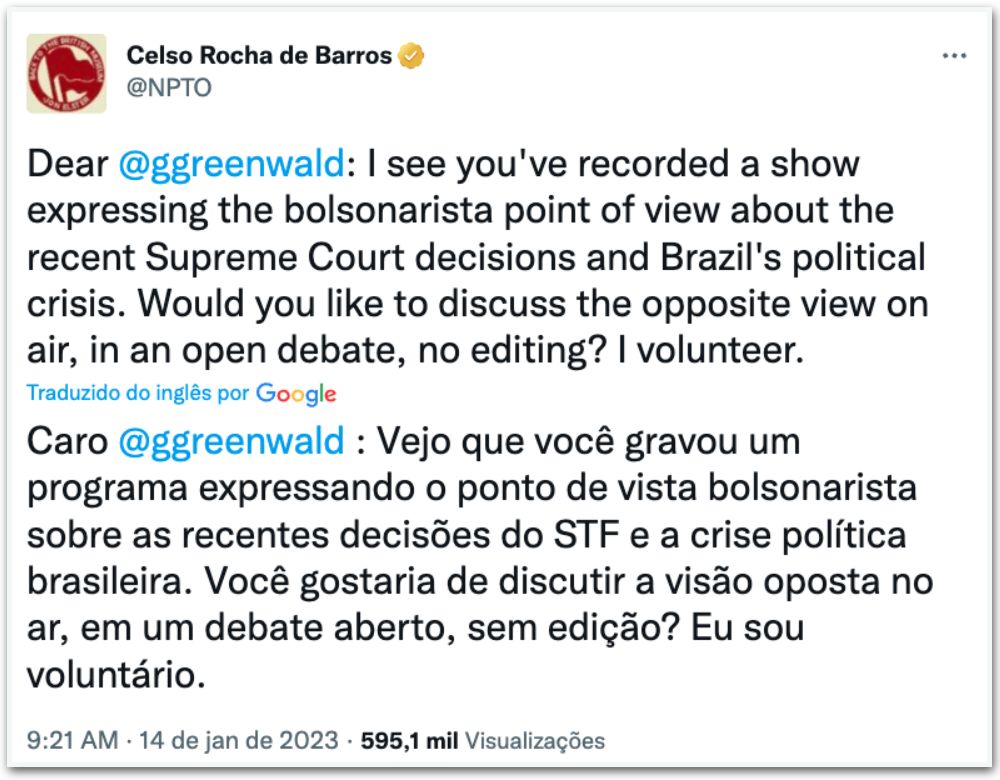 O jornalista Glenn Greenwald aceitou no sábado (14.jan.2023) debater as decisões do ministro do STF (Supremo Tribunal Federal) Alexandre de Moraes com o sociólogo Celso Rocha de Barros, colunista do jornal Folha de S. Paulo.