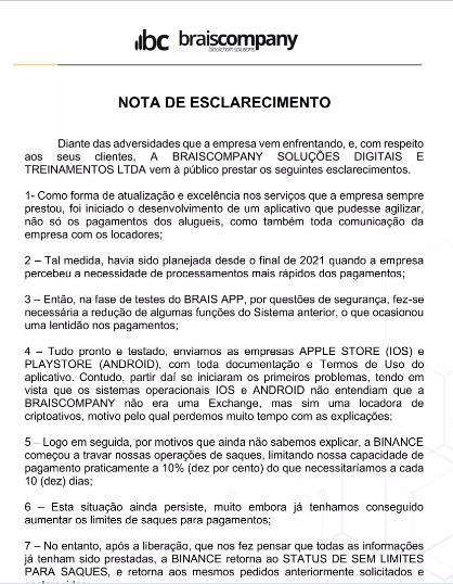 Como apurou o ClickPB, em nota divulgada à imprensa, a Braiscompany responsabiliza a Binance pela falha nos pagamentos a investidores, ocorrida desde o fim do ano passado e informa que a empresa fala em socorro de reservas para cumprir com as obrigações e que “está fazendo uso de todos mecanismos legais e de reserva para honrar os compromissos contratualmente agendados”, diz o documento.