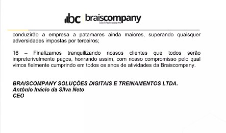 “Finalizamos tranquilizando nossos clientes que todos serão impreterivelmente pagos, honrando assim, com nosso compromisso pelo qual vimos fielmente cumprindo em todos os anos de atividades da Braiscompany”, conclui o texto.