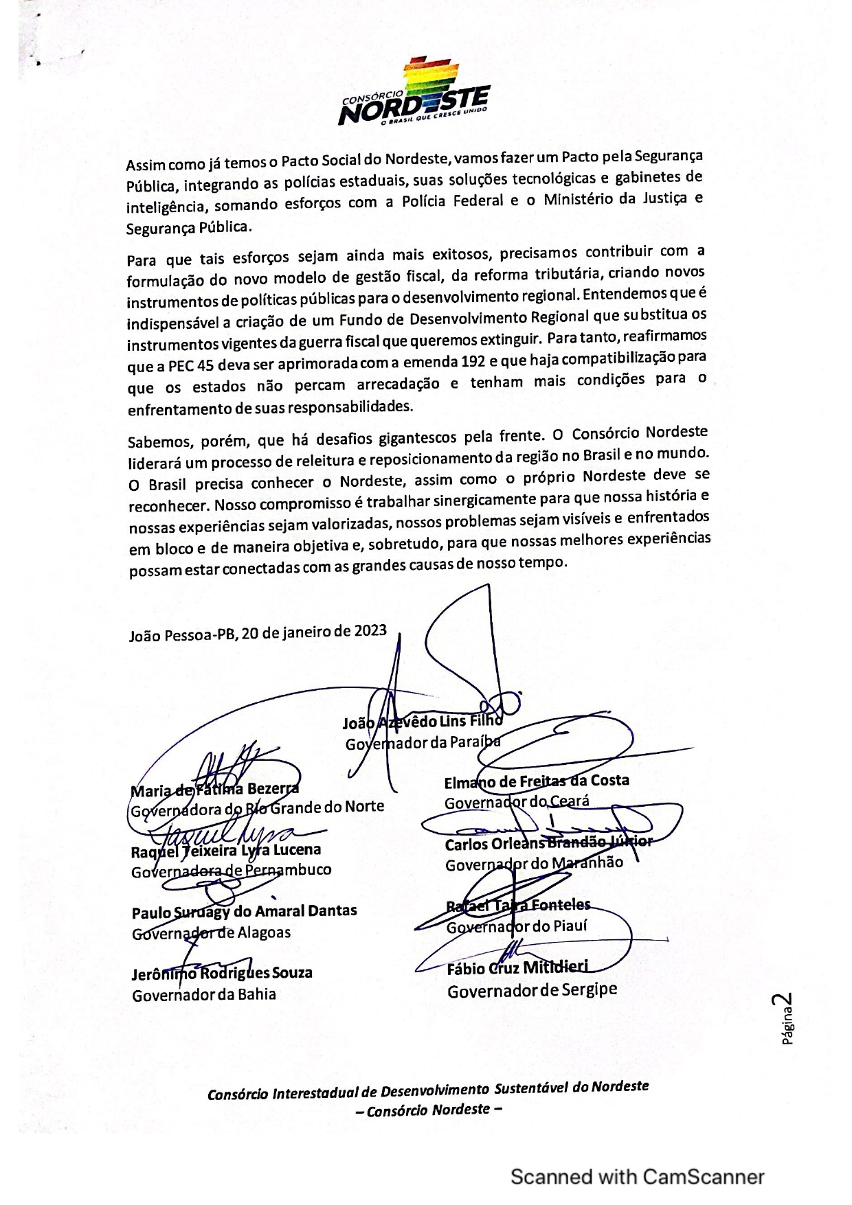 Na ‘Carta de João Pessoa’, apresentada após o encontro dos gestores nordestinos, foi apontada a necessidade de um ‘Pacto pela Segurança Pública’. “Assim como já temos o Pacto Social do Nordeste, vamos fazer um Pacto pela Segurança Pública, integrando as polícias estaduais, suas soluções tecnológicas e gabinetes de inteligência, somando esforços com a Polícia Federal e o Ministério da Justiça e Segurança Pública.”