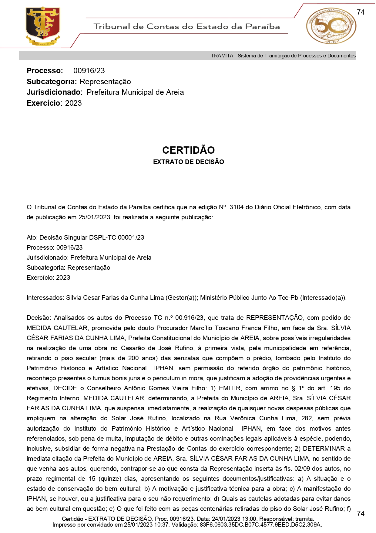 Além da proibição de despesas, a cautelar determina que a prefeita Silvia César Farias da Cunha Lima, caso deseje se contra-por a decisão, terá quinze dias para detalhar qual a situação e o estado de conservação do bem cultural, a motivação e justificativa técnica para a obra; a manifestação do Iphan, caso exista, ou a justificativa para não requerimento; quais cautelas adotadas apra evitar danos ao bem; e o que foi feito com as peças bicentenárias retiradas do local (piso).