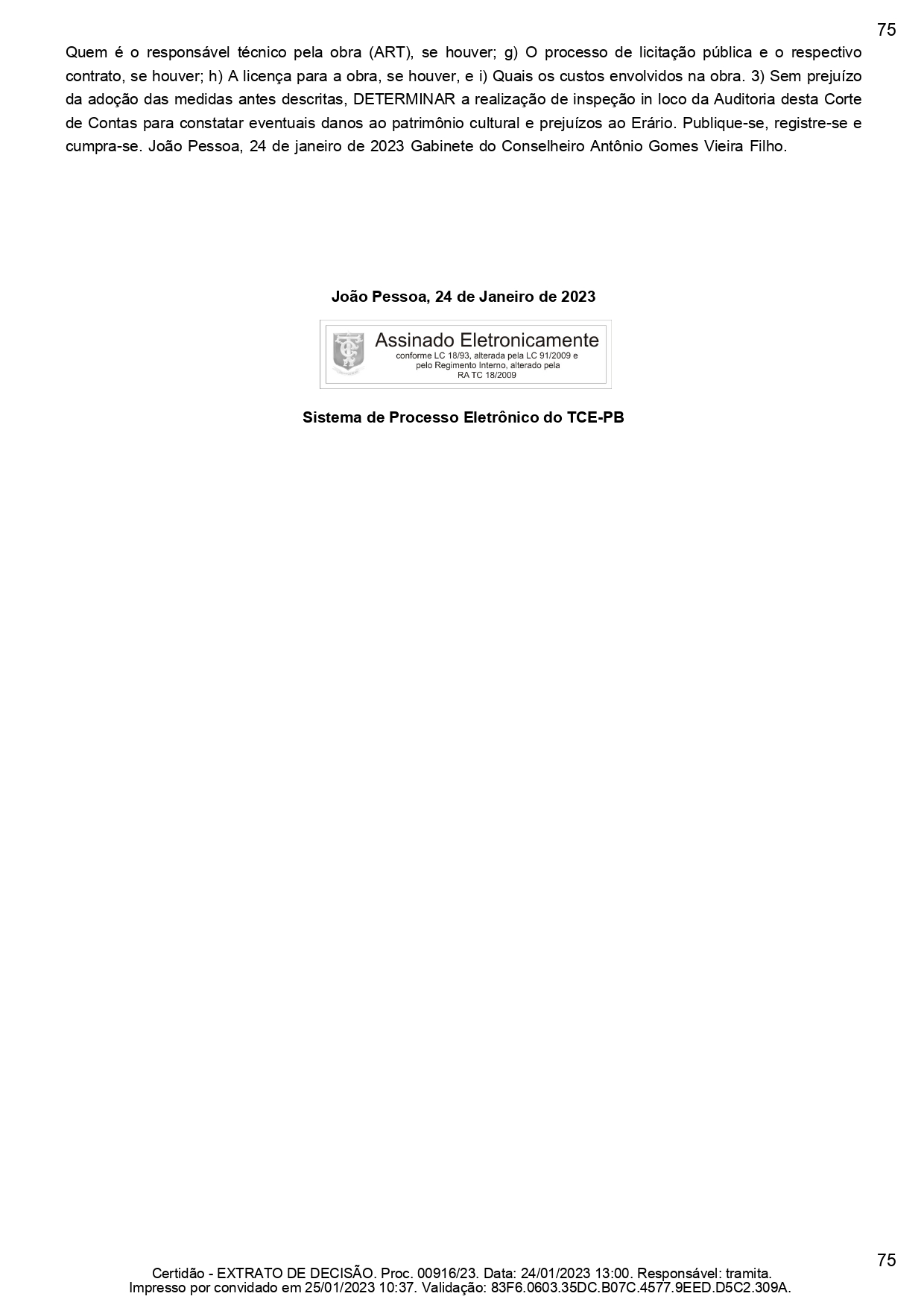 De acordo com o texto, a decisão foi tomada após uma representação promovida pelo Procurador Marcílio Toscano Franca Filho, do Ministério Público de Contas do estado (MPC-PB). A representação citava a necessidade de uma cautelar contra à gestão, após a retirada do piso secular das senzalas que compõem o edifício, pela prefeitura, sem autorização prévia do Iphan.