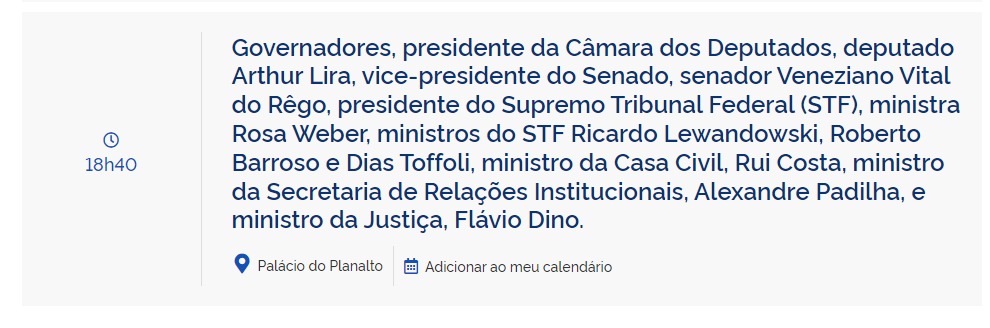 Além dos governadores, o encontro irá contar com a presença do presidente da Câmara dos Deputados, deputado Arthur Lira, vice-presidente do Senado, senador Veneziano Vital do Rêgo, presidente do Supremo Tribunal Federal (STF), ministra Rosa Weber, ministros do STF Ricardo Lewandowski, Roberto Barroso e Dias Toffoli, ministro da Casa Civil, Rui Costa, ministro da Secretaria de Relações Institucionais, Alexandre Padilha, e ministro da Justiça, Flávio Dino. Veja detalhes: