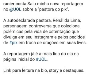 Com o auxílio de assessoria jurídica, a Pastora Renállida vem a público rebater todas as difamações das quais tem sido vítima ao longo dos últimos anos, em especial matéria publicada no site da UOL na data de 24 de janeiro de 2024. A visibilidade nacional que possui, devido ao perfil teológico e benéfico em tantas vidas, mistura-se a uma campanha pejorativa para diminuí-la, por ser uma mulher de origem à margem do capitalismo nacional e que alcançou uma vida que muitos desfrutam desde o nascimento. Críticas à imagem, às roupas que usa e aos procedimentos que já realizou são pautadas nos pilares de uma sociedade patriarcal que busca desprestigiar e silenciar mulheres em posição de destaque. Afinal, nunca se observou tamanha perseguição a pastores homens brancos e cisgêneros do centro do capital brasileiro; estes são ovacionados e eleitos representantes populares. As alcunhas com que se referem à pastora por si só demonstram o grau de discriminação. São termos que ferem qualquer pessoa, utilizados de modo a ridicularizá-la. As mulheres, ao longo da história do patriarcado, são taxadas por adjetivos baseados em julgamentos levianos para atacar a honra e imagem, a fim de menosprezá-las socialmente e retirá-las de posições de destaque. A Pastora Renállida, como qualquer influenciador digital, recebe presentes ao fazer publicidades em campanhas de marketing, seja de produtos ou de serviços lícitos, inexistindo qualquer impedimento em relação ao seu exercício sacerdotal ou relação hierárquica com demais vertentes protestantes. Ser acusada de traição é apenas mais um exemplo de que a sociedade especula e culpa mulheres por separações. Ocorre que a pastora nunca manteve relação extraconjugal. Sempre respeitou o ex-esposo e, sendo divorciada, por óbvio, dispõe do direito de recomeçar a vida sentimental ao lado do parceiro que julgar adequado. Por ser uma pessoa pública, o falatório especulativo sobre uma possível traição advinda da parte dela é mais uma investida machista contra uma mulher/mãe que enfrentou um processo judicial, como tantas outras no Brasil que sofrem diariamente a via crucis de custear processos judiciais e as despesas dos filhos quando se tornam mães sem apoio financeiro dos ex-companheiros. Explorar publicamente questões de direito de família que tramitaram em segredo de justiça é agir de má fé e com crueldade. Salienta-se que não cabe a ninguém tecer comentários sobre a responsabilização pelo fim de sociedade conjugal, devendo ser combatida a exposição da vida particular alheia em meios digitais com intuito de auferir benefício econômico e engajamento nas redes. Para concluir, reitera-se o combate às fakes news tendo em vista o mal ocasionado e repercussões negativas à saúde das pessoas envolvidas.
