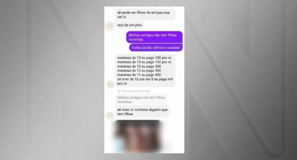 O print de uma conversa do suspeito com uma pessoa mostra uma tabela de preços que seriam pagos por ele pelos encontros criminosos, a depender da idade. Pela conversa, o valor mais alto a ser pago seria de R$ 1 mil para encontros com meninas entre 8 e 10 anos de idade.