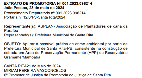A Prefeitura de Santa Rita virou alvo de investigação por suposto crime ambiental na área da barragem Gramame-Mamuaba, pelo Ministério Público da Paraíba (MPPB). O procedimento preparatório é coordenado pelo promotora Miriam Pereira Vasconcelos, da 6º Promotor de Justiça da Promotoria de Justiça de Santa Rita. A abertura da investigação foi divulgada no Diário Oficial da instituição na edição desta sexta-feira (24).